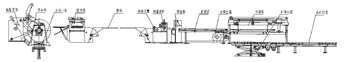 生產(chǎn)線主要由上料小車(chē)、開(kāi)卷機(jī)、校平機(jī)、送料機(jī)構(gòu)、剪板輸送裝置、堆垛裝置等組成。